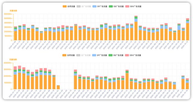 卖家精灵sellersprite数据显示,从2024年1月到10月,产品的月流量基本在30–40万之间,自然流量占比常常超过60%。不过,新增访客与广告投放(SP、SB、SBV)明显不足,其广告流量的整体占比只有3成左右。