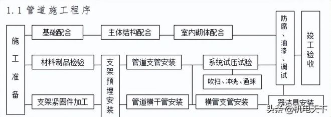 安装管道时应按先主后次,先立管后支管的顺序逐层逐段安装,不可跳装或分段装,以免管段与管段间连接困难和影响管道整体性能。