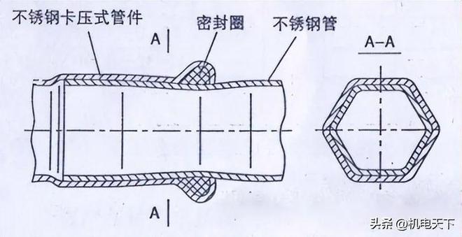 卡压式管件端内部“O”型槽内装有密封圈,安装时将管道一端插入管件的端口内,用专用卡压工具进行卡压,将管道与管件的连接部位卡压成六角型(见图4-1),形成足够的连接强度;同时管件内“O”型槽内的密封圈,在压力作用下被压缩,依靠管材的支撑向外压紧密封圈,保证了连接的密封性。