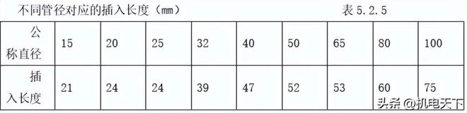 2.2.5 插入管子:将管子笔直插入管件内,注意不要碰伤O型密封圈,并确认管件端部与画线mm以内。插入过紧时可在管子上沾点水,不得使用油脂润滑。不同管径要求的插入长度不同,插入长度对照表,必须确保插入长度+2mm。