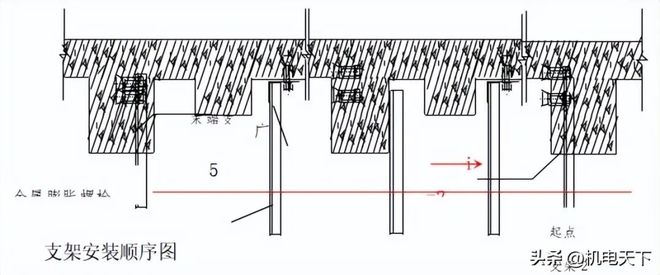 (2).水平横管支架间设置的最大间距应符合下表规范要求,其安装高度视其设计图纸和现场实际情况而定。支架安装顺序如下图: