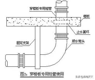A、管道支架安装:排水管每层距结构板0.3m处及1.8m处分别设一个固定支架。当立管在楼层上安装时,立管穿楼板应采用“穿楼板专用短管”。该短管的止水翼环放在楼板二分之一厚度处,用膨胀水泥砂浆填筑楼板孔洞,即可防止渗漏又使该处成为固定支撑点,即可当作一个固定支架。