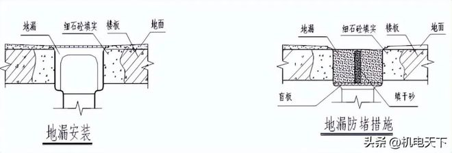 D、雨水管道安装同排水管道安装。其中地漏安装根据施工图的平面位置进行设置,且必须设于地面最低处,地漏安装时,地面应坡向地漏,并且地漏的篦子顶面应低于其周围地面的5~10毫米。为保证管道今后使用流排畅通,在各地漏处设置盲板堵上,安装做法如下