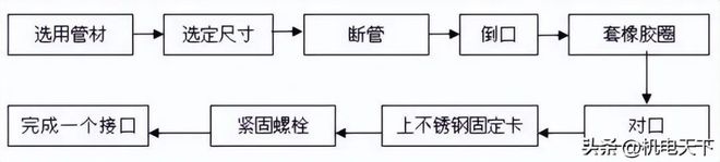 ①安装前将直管及管件内表面粘结的污垢、杂物和承口、插口、法兰压盖结合面上的泥沙等附着物清除干净; ②将不锈钢卡箍先套在接口一端的管身上,在管接口外壁涂一些肥皂水作为润滑剂,将橡胶圈的一端套在管接口上(一般是套在已固定好的管子或管件这一端),并应套入至安装(主止水橡胶带处)规定深度。 ③将橡胶圈的另一头向外翻转。 ④将要连接的管件或直管的管口放入橡胶圈内,校准方位,与另一管端接口挤实,把翻转的橡胶圈口翻回正常状态 ⑥再次校准管道的坡度、垂直度、方位,初步用支(吊)架固定住管道、移动不锈钢卡箍套在橡胶圈外合适的位置,用专用套筒力矩扳手(6.76牛。米)拧紧卡箍的紧固螺栓。对于有四道夹板的大口径管箍,中间的紧固螺栓先拧紧之后,再紧外侧的夹板螺栓,在所有情况下,夹板的紧固需交替进行,以便不锈钢舌板均匀收紧,直至力矩扳手滑扣,接口就算完成,然后将支(吊)架上螺栓拧紧,使管道牢固地定位。