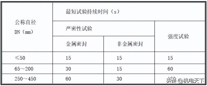 阀门的强度试验压力为公称压力的1.5倍;严密性试验压力为公称压力的1.1倍;试验压力在试验持续时间内应保持不变,且壳体填料及阀瓣密封面无渗漏。阀门试压的试验持续时间应不小于下表要求: